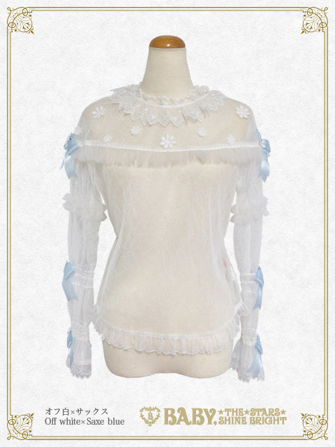 - White lace fabric×Saxe blue opal ribbon×White lace×White soft tulle