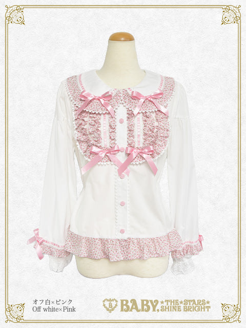 - White×Pink small floral pattern×White lace×Pink ribbon