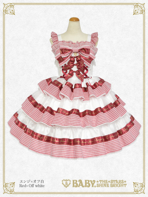 ふんわりとしたボリューム感がとびきりSweetなジャンパースカートは、前身頃に並んだおリボンや、2か所のおリボン編み下げ仕様がCUTE♡