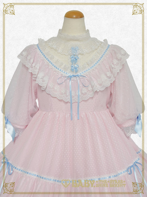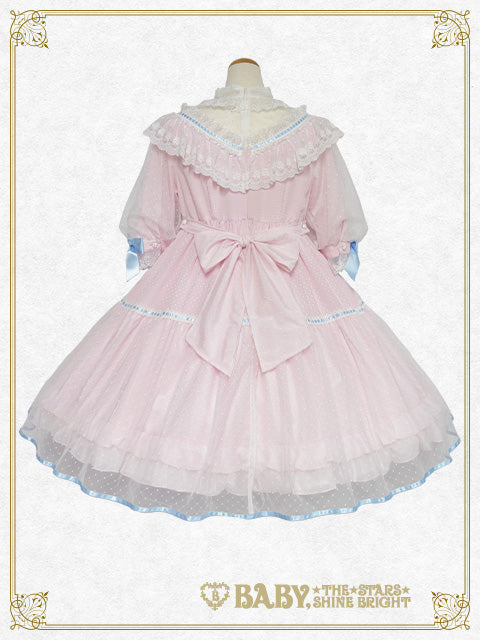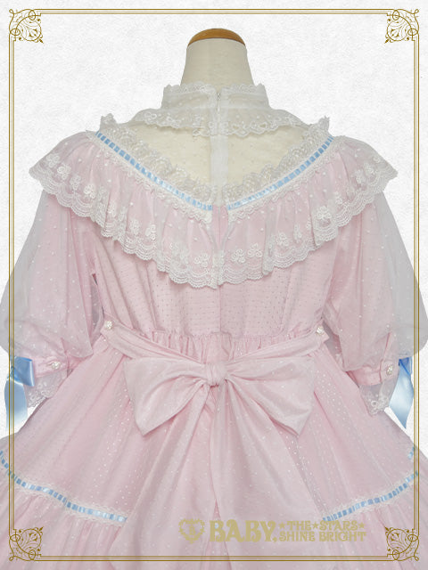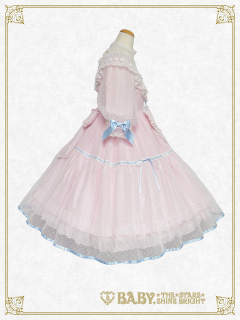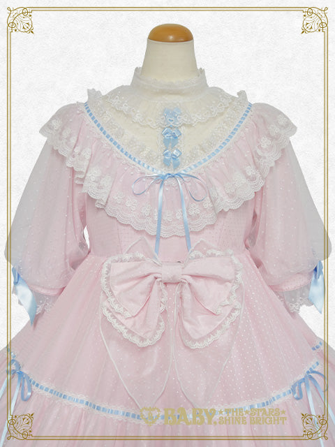 チュールが透けるデコルテ部分にあしらわれたレースとミニおリボン、肩周りやスカートのおリボン通しレース切り替えデザインがとってもCUTE♡