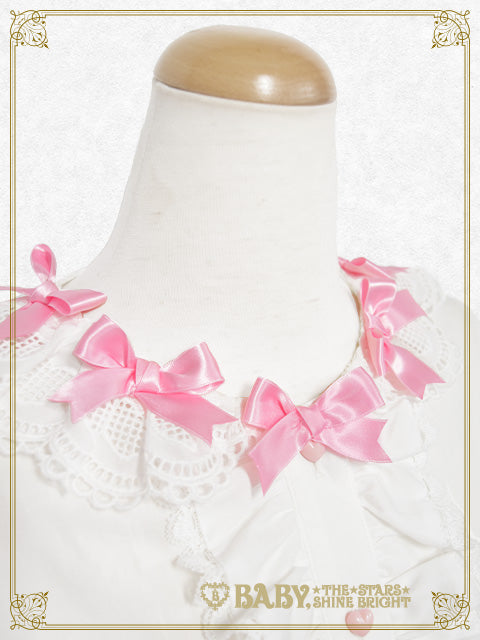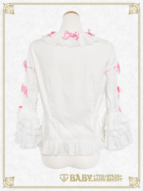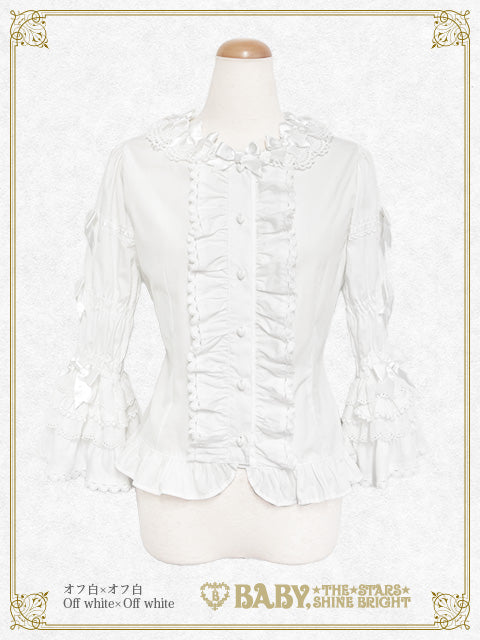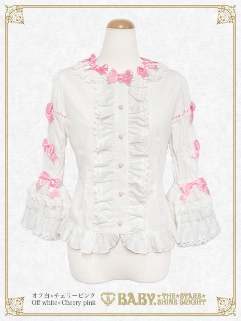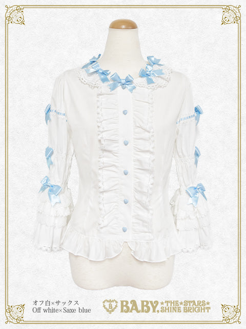 衿元の大きなハートの綿レースや、ころんとした沢山のおリボンがお顔周りを華やかに彩ってくれる七分袖ブラウスは、