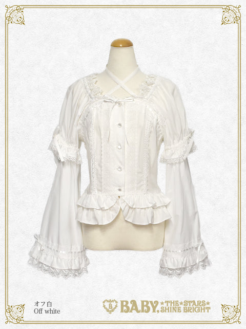 華やかな姫袖仕様、胸元や身頃にあしらわれた贅沢なレース、シャーリング仕様の身頃のデザインが特徴的な、長年愛されているBABY定番のブラウスです♪