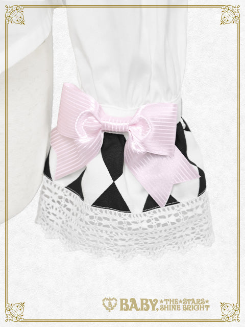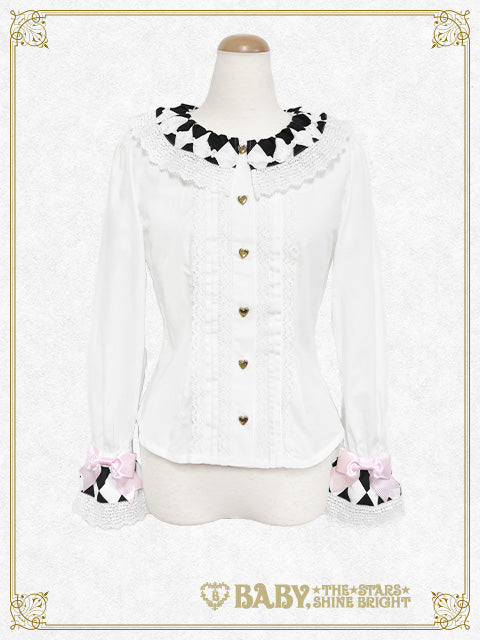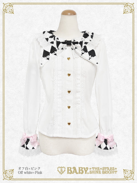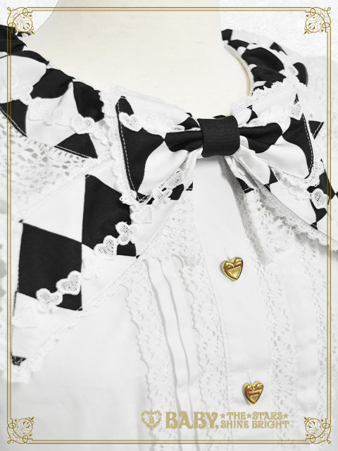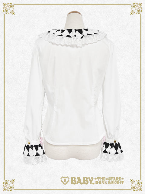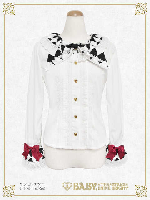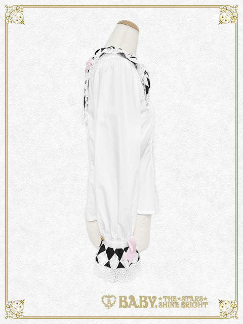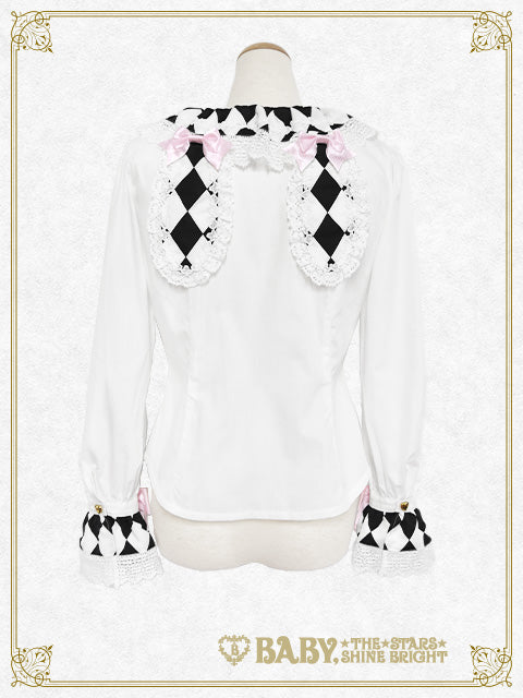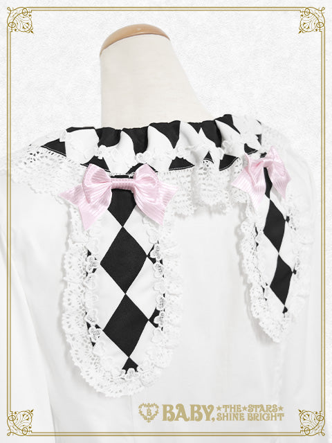 ダイヤ柄のフリル衿に、お取り外し可能なおリボン、うさみみ飾りをあしらったブラウスです♡