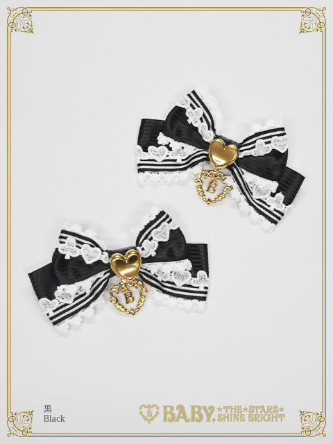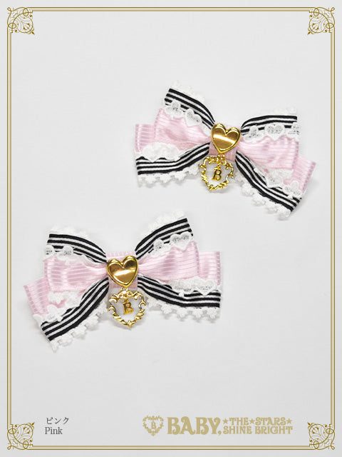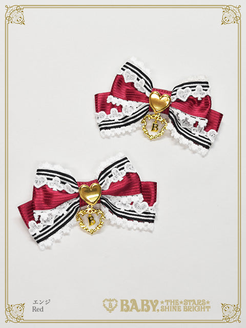 配色感のある2種類のストライプサテンリボンに、トランプモチーフのケミカルレースやハート型ボタンをあしらったリボンクリップです♡