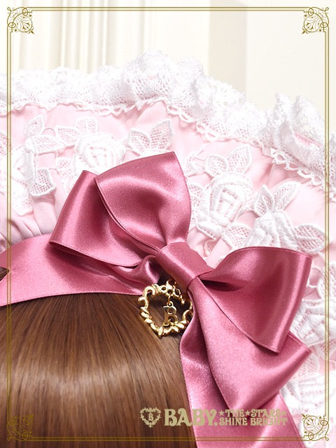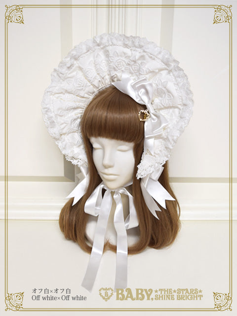 ブリム部分にあしらわれた大ぶりの薔薇モチーフケミカルレースが目を引く、華やかなボンネットです♪