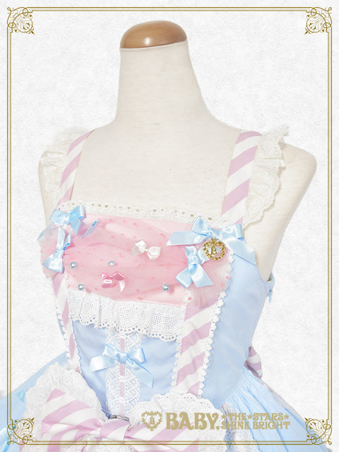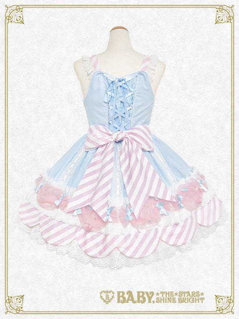 身頃やウエストリボン、スカートにもストライプ柄の生地を使用し、随所にキャンディーの要素をたくさん取り入れて可愛らしく仕上げました。