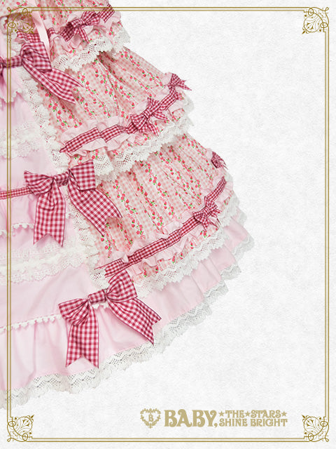 お花×ギンガムの柄生地にいちごやリボンが描かれた、Sweet&Cuteな生地を使用したジャンパースカートです♡