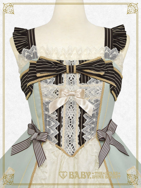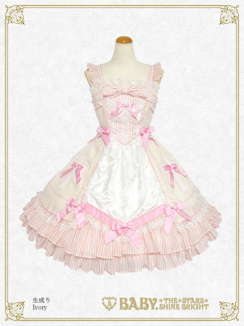 ストライプ地フリルやレース地にたくさんのリボンとギャザーレースをあしらった、BABY定番の華やかなジャンパースカートは生地の組み合わせにこだわりと遊び心を忍ばせたデザインです♡
