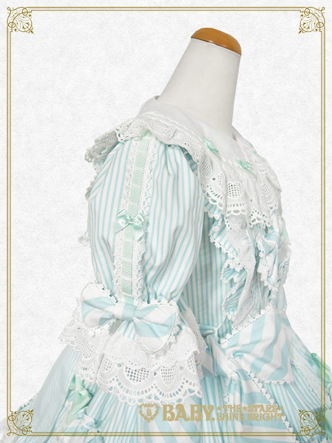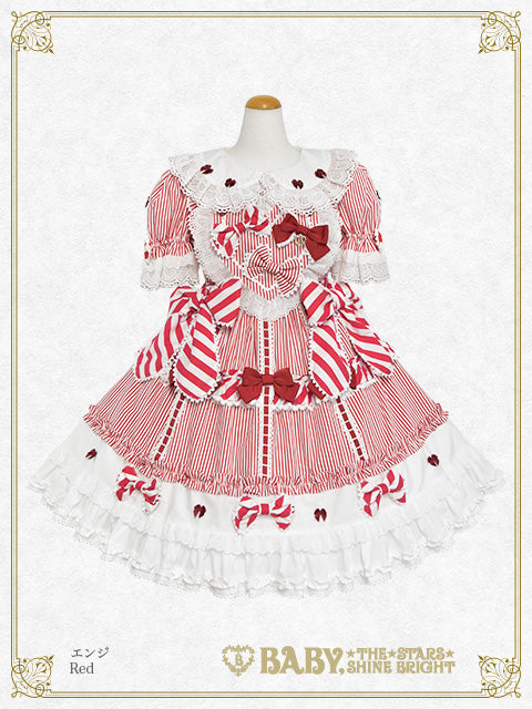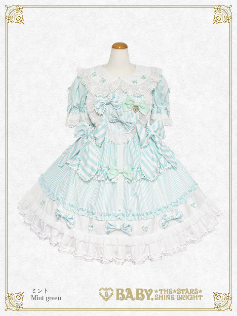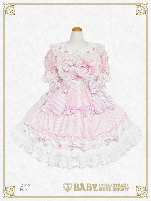 お取り外し可能なハート型の胸元に様々なおリボンをデコレーションしたデザインが愛らしいワンピースは、幅の異なるストライプ地の組み合わせが印象的で、お袖やスカートにあしらわれたおリボン通しレースもさりげないポイントです♪
