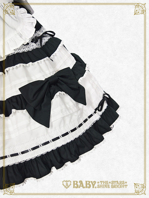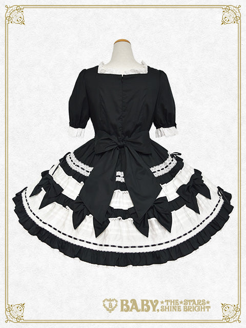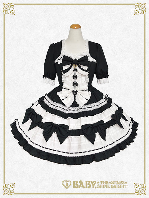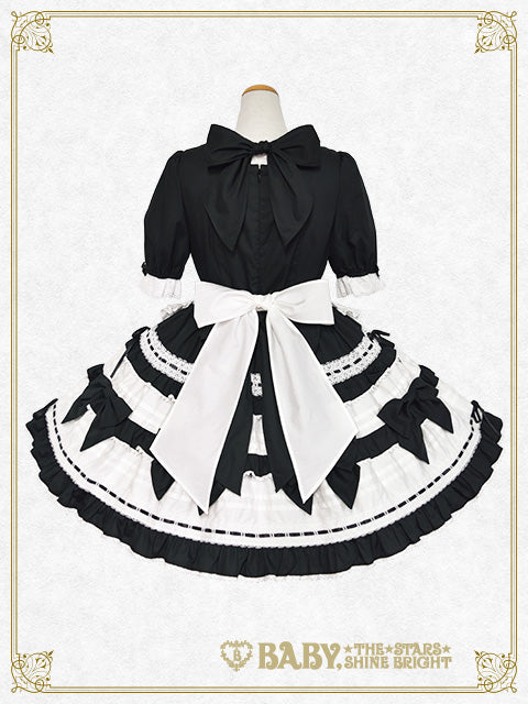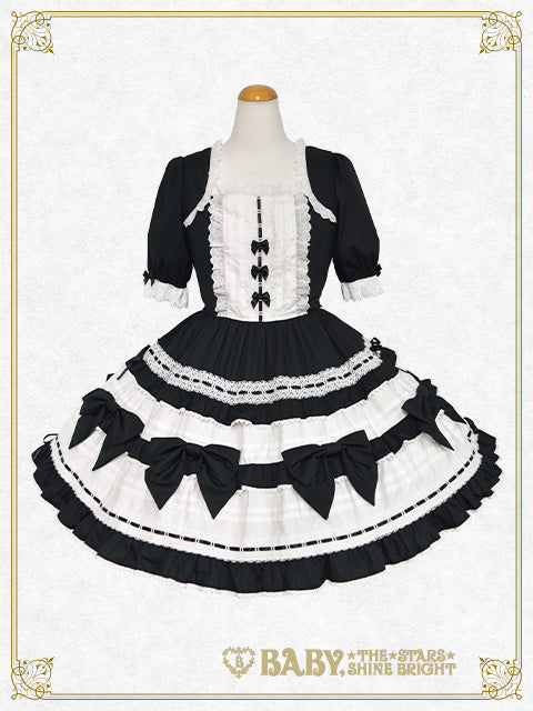 胸元やスカートにあしらわれた大きなおリボン飾りが目を引くワンピースは、身頃とスカートの配色切替に施された繊細なピンタック、リボン通しレースの装飾がポイント♪