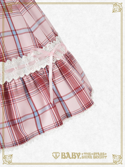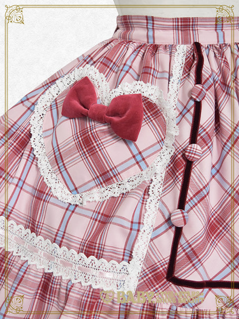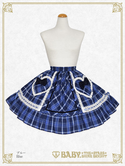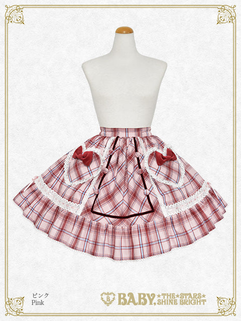 ハートモチーフのポケットに別珍素材のおリボンをデコレーションした、タータンチェック地のスカートです♡