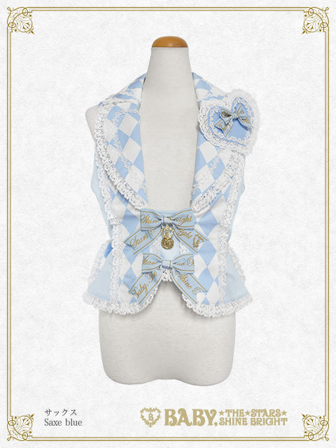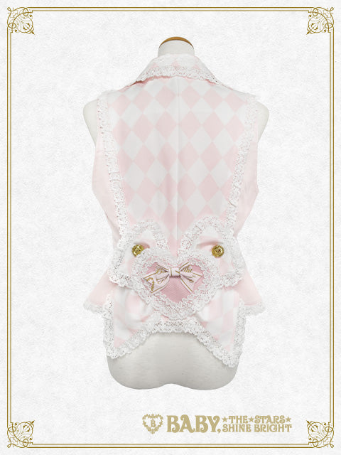 襟や前後身頃に部分的に使用されたダイヤ柄の生地が目を引くベストは、お取り外し可能なハートモチーフやお背中の大きめおリボン、BABYオリジナルのグログランロゴリボンがポイント!