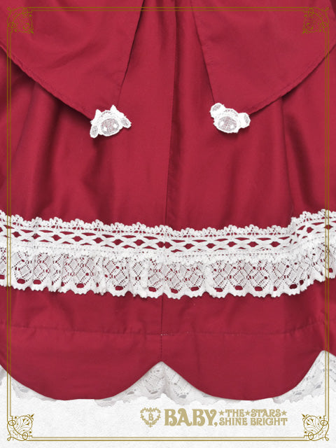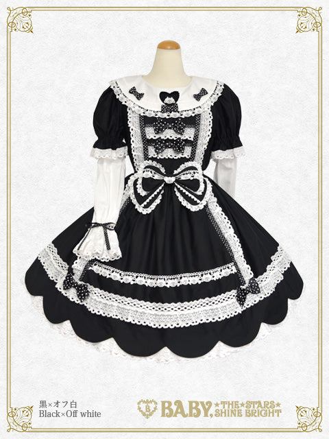 くみゃちゃんのケミカルレースをあしらった衿のデザインと、うさくみゃちゃんがのぞくハート窓が愛らしいワンピースは、衿後ろのうさみみモチーフや、スカート裾のスカラップ仕様、お砂糖菓子のようなドットリボン、クリームのようなたっぷりのトーションレースで可愛くデコレーションした、とってもCUTEな1着です♡