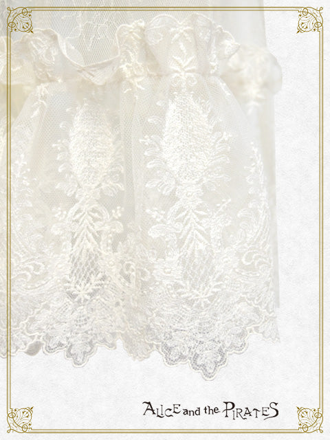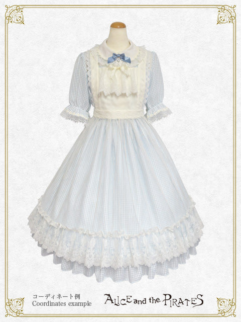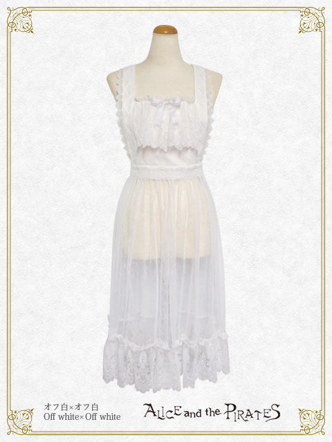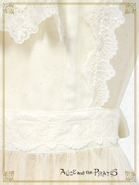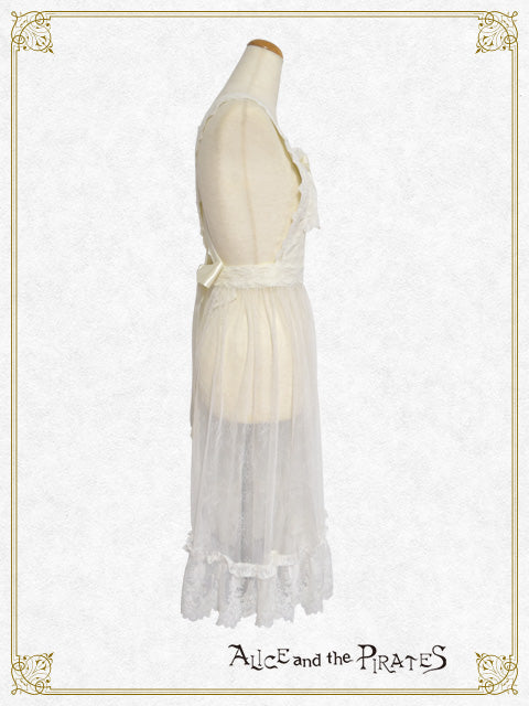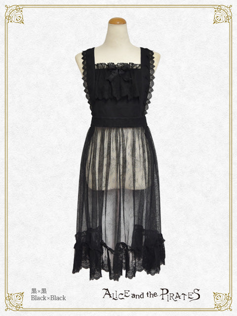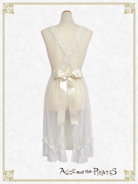 繊細なチュールレースを使用したタブリエは、胸当て・ウエストベルト部分に梨地にレース地を重ね、スカート部分のみが上品に透けるデザインで、下にお召し頂くお洋服が見える仕様となっております♪
