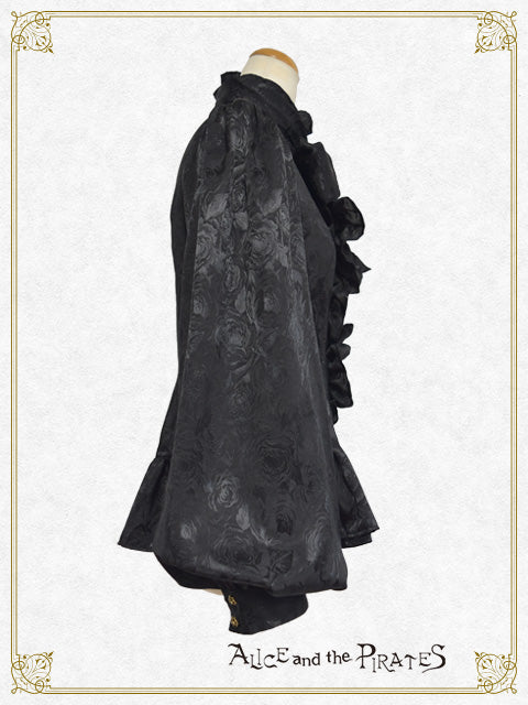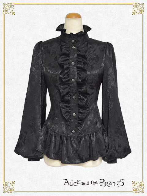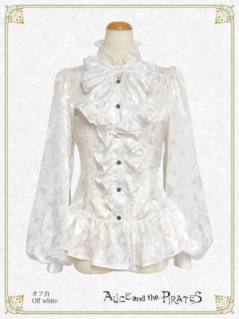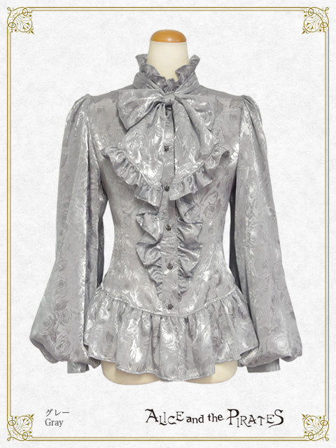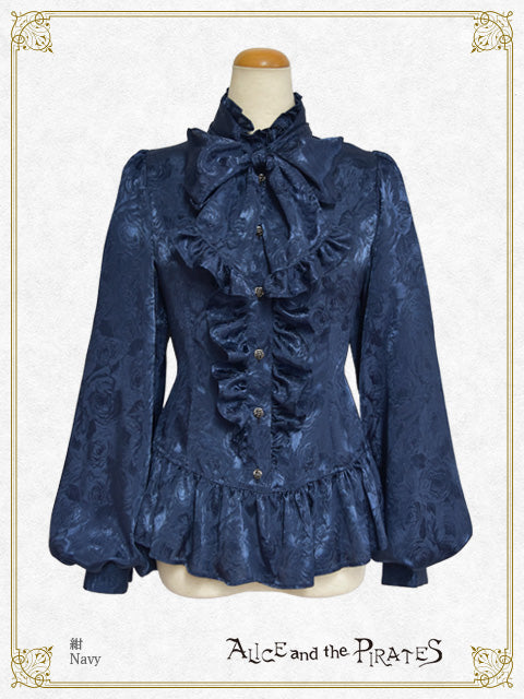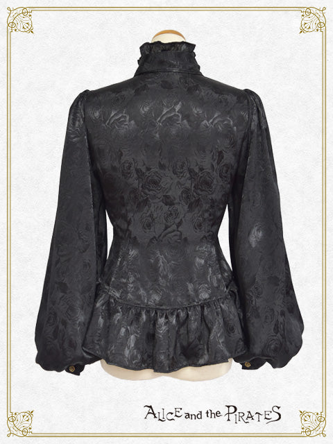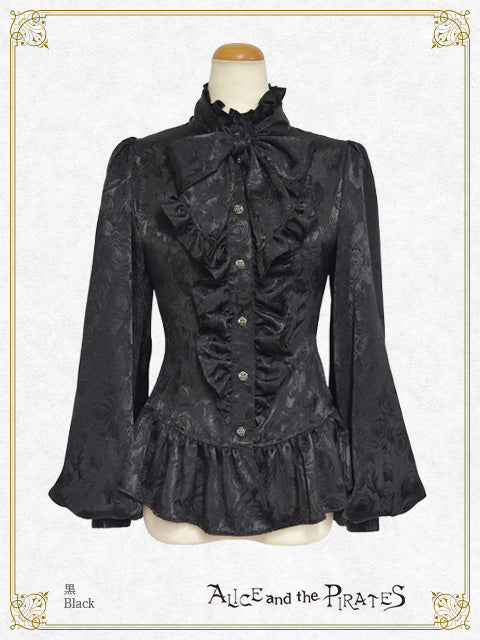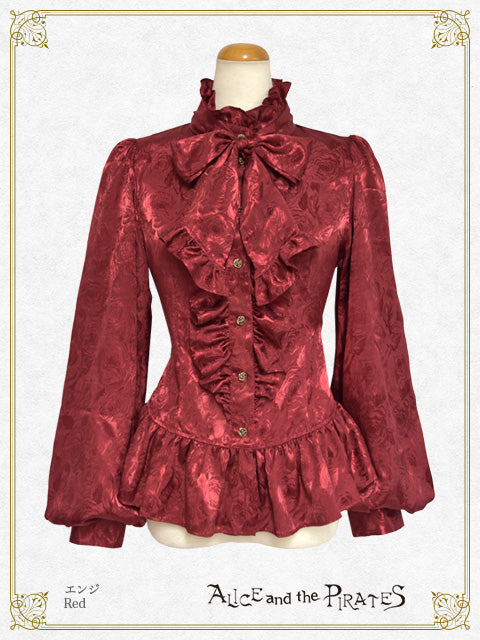 シンプル&クールな立ち襟と同生地のタイ、裾のフリルが特徴的なPIRATES定番のRomeoブラウスが、薔薇柄ジャガードサテン地&ボリュームスリーブタイプで登場です。