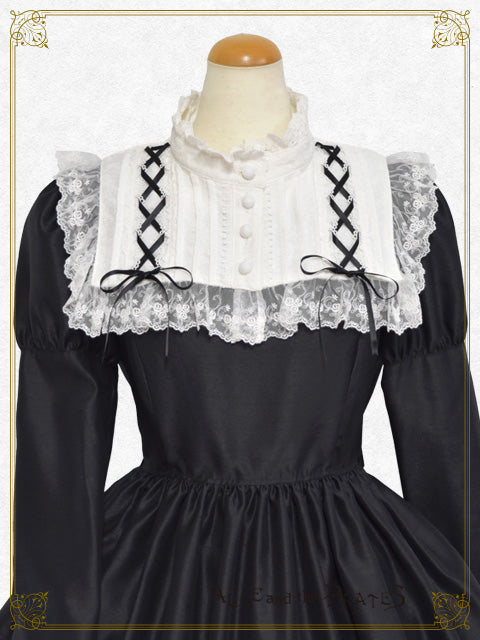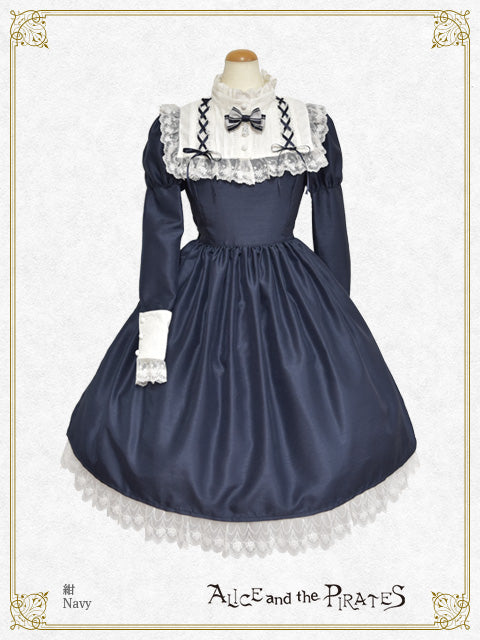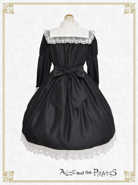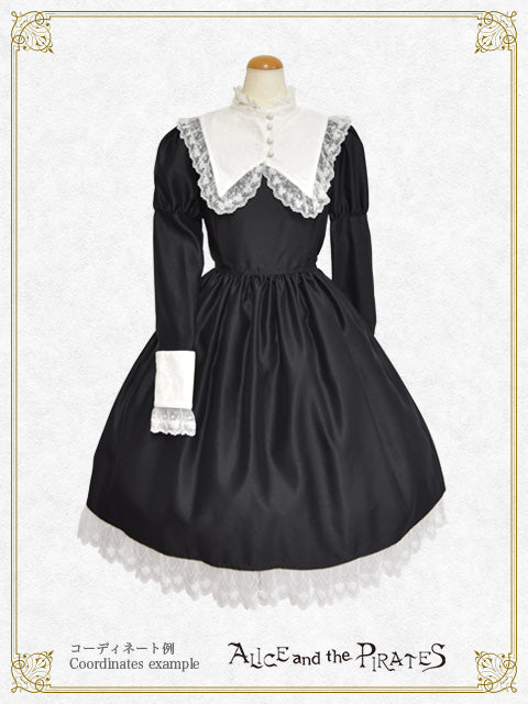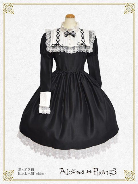 上品な光沢感とハリ感が特徴のシャンタン地を土台に、様々なレースやおリボンでデコレーションした付け衿がセットになったワンピースです♪