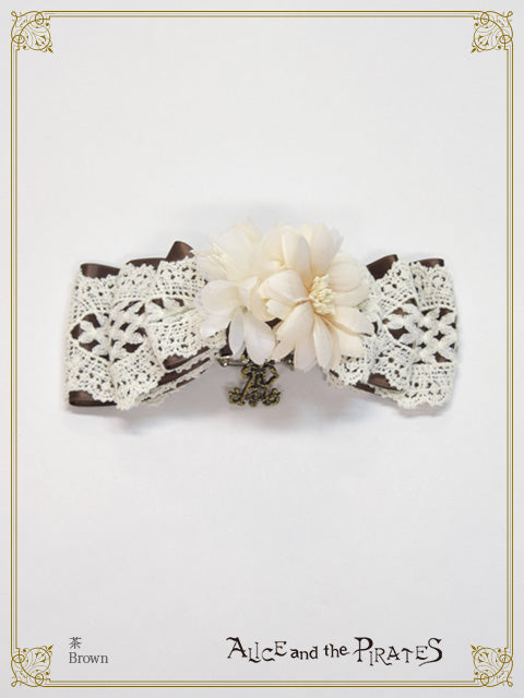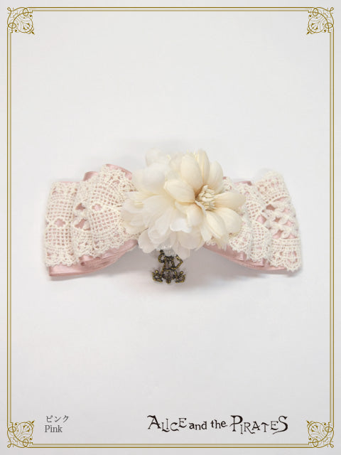 サテンおリボンにケミカルレースを重ねたデザインと、可憐に咲くお花パーツがクラシカルかつ可愛らしいリボンクリップです。