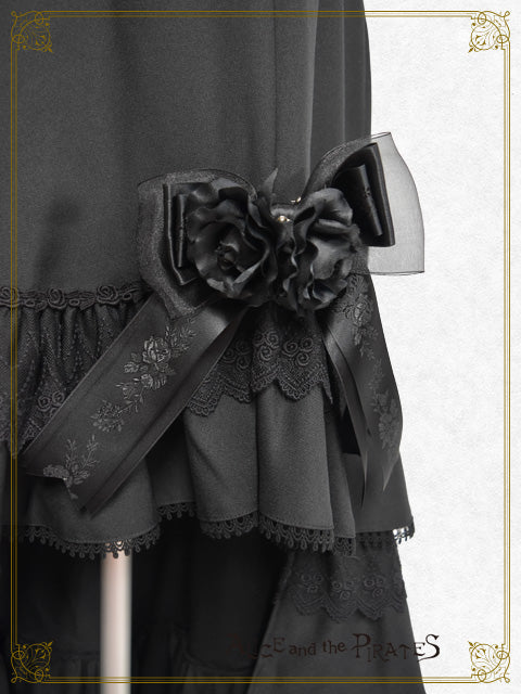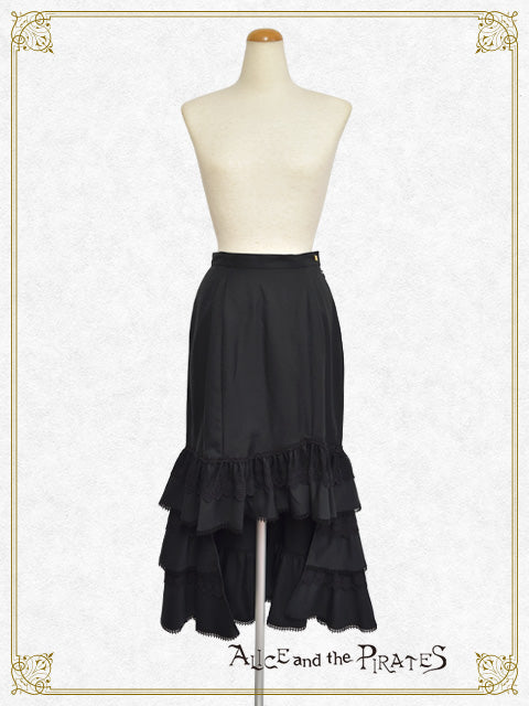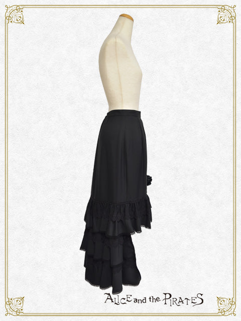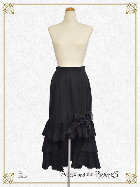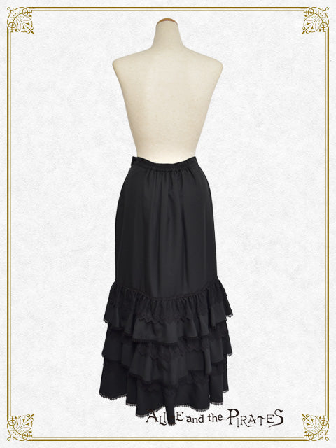 マーメイドシルエットが特徴的な、PIRATESらしいこだわりが詰め込まれたスカートは前部分は膝下丈、後ろ部分はチュールレース・ケミカルレースをたっぷりと重ねた3段フリルの長めの仕様となっておりゴシックな雰囲気を存分にお楽しみ頂けるデザイン。