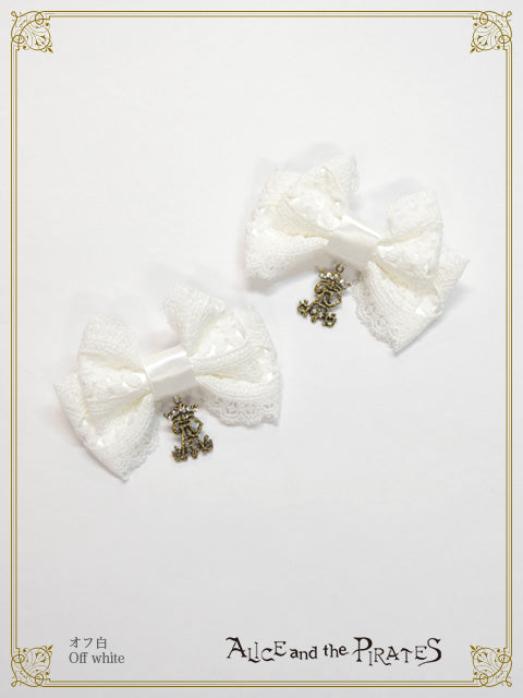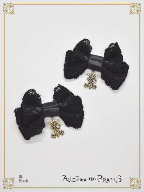 サテンおリボンにケミカルレースを重ねた、程よい大きさが使いやすい2個1組のおリボンクリップです。