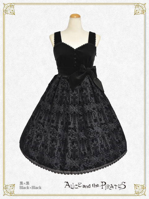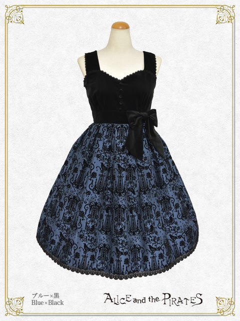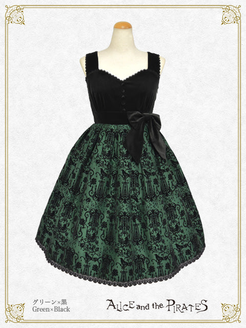 スカート部分の繊細な総柄が映えるよう、身頃に重厚な雰囲気が魅力の別珍生地を使用したジャンパースカートは