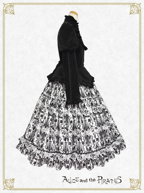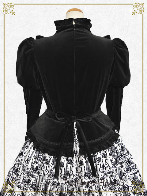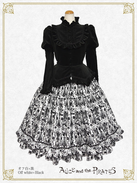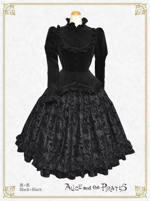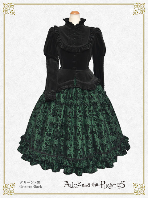 ジャケット風の別珍素材の身頃はパフ袖やヨークの仕様にすっきりとした立衿デザインで、ふんわりとしたスカートと好バランスです。