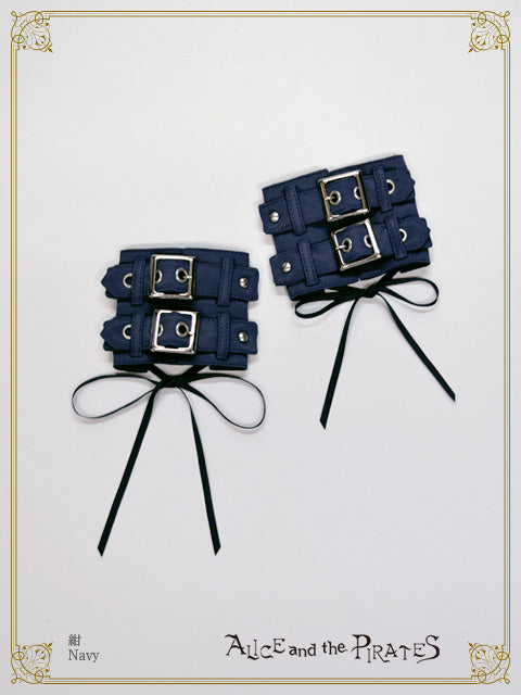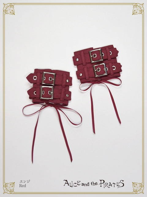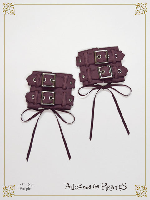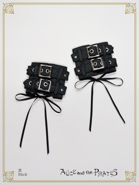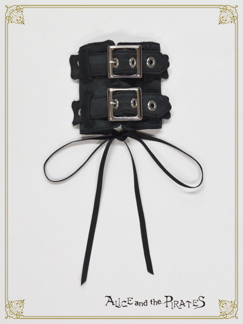 レザー調のサテン生地を表地として使用したリストバンドは左右1組で、2本のベルト&バックル使いがどこか退廃的な印象。