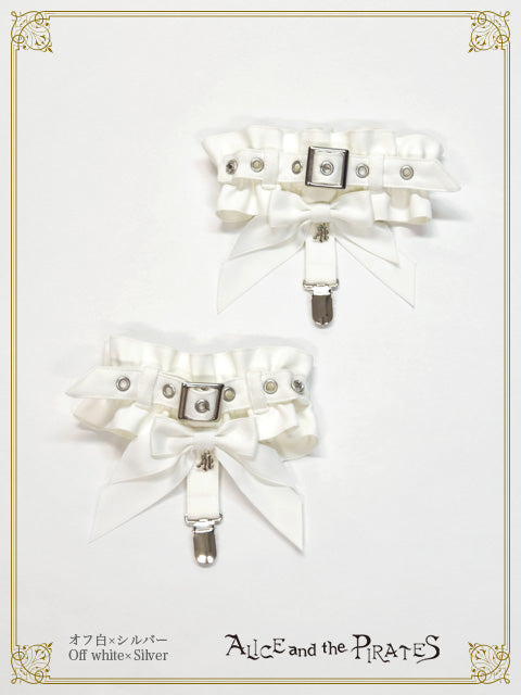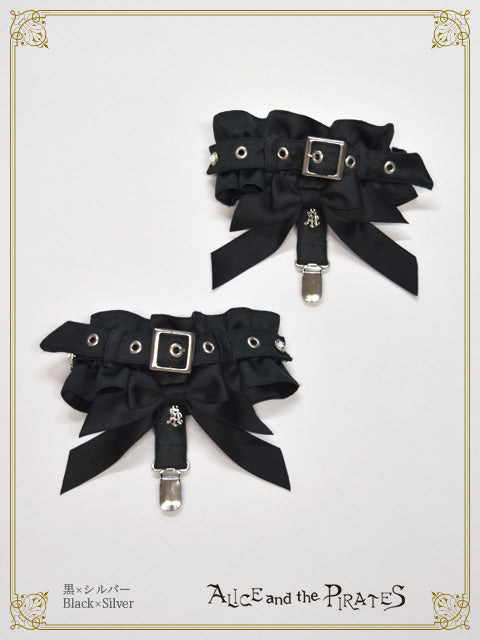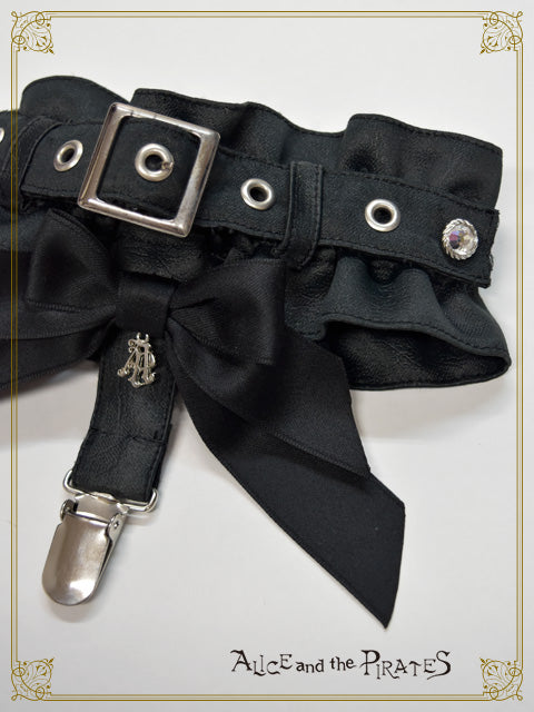 合皮に見えるサテン地のお作りで、ハードな見た目に反して柔らかい素材感が特徴的な靴下留めは