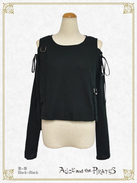 少し長めのお袖と肩をチラ見せするデザイン、そして前身頃の2本の共地飾りベルト&バックル使いが継ぎ接ぎ感を演出し、