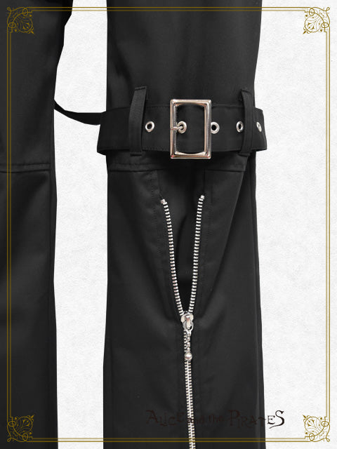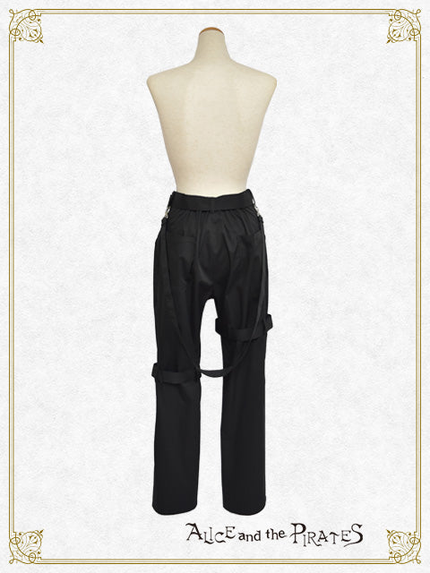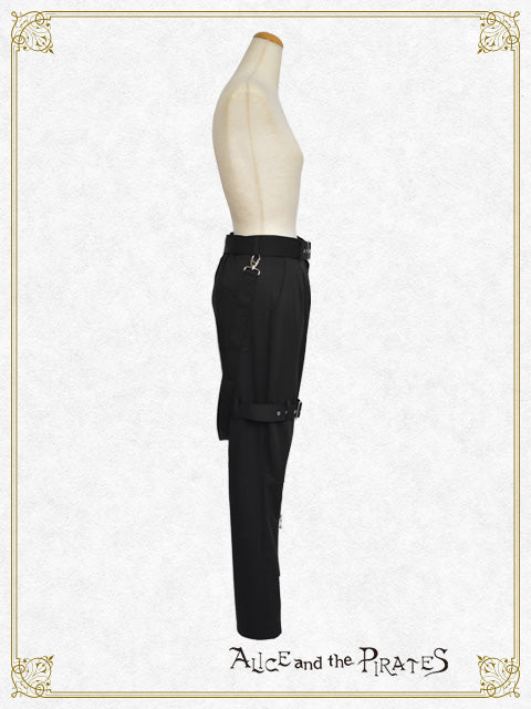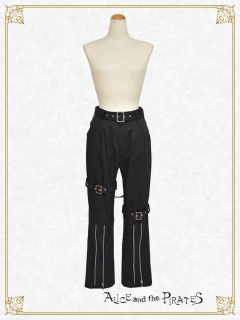 アシンメトリーな配置であしらわれた左右の飾りベルト&バックル使い、開閉でアレンジが楽しめる膝下のファスナーが特徴的なロングパンツです。