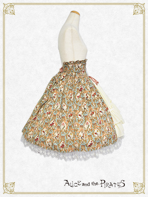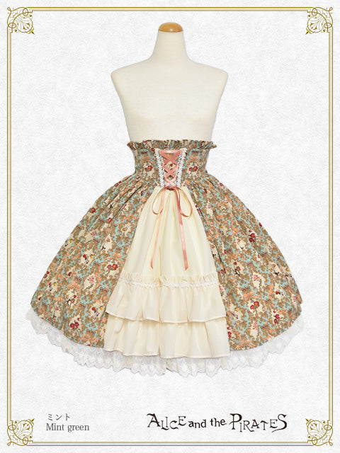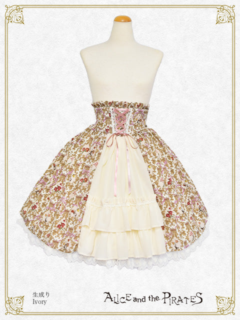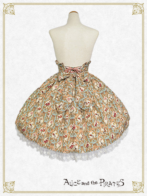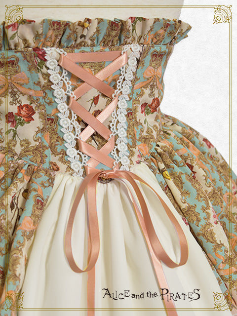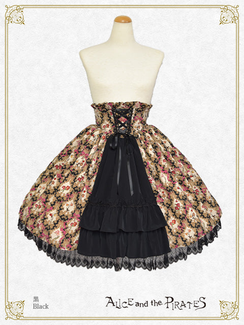 コルセット一体型のようなデザインが特徴のスカートは、前バッスル仕様でふんわりと広がります。
