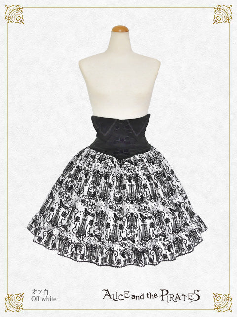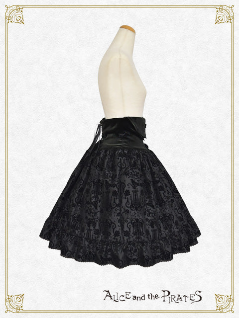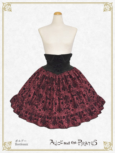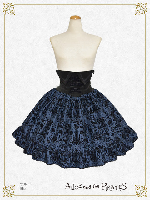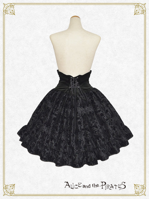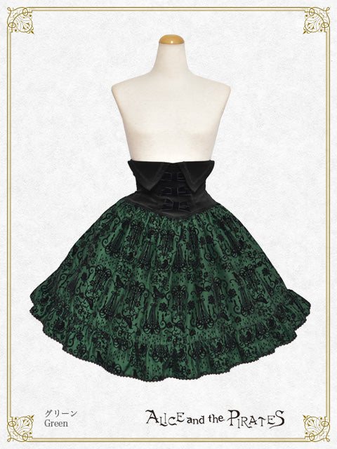 コルセット風の別珍素材のウエスト部分には同じ素材のおリボンが並び、生地を折り返したようなデザインや後ろの編み上げおリボン仕様もポイント!