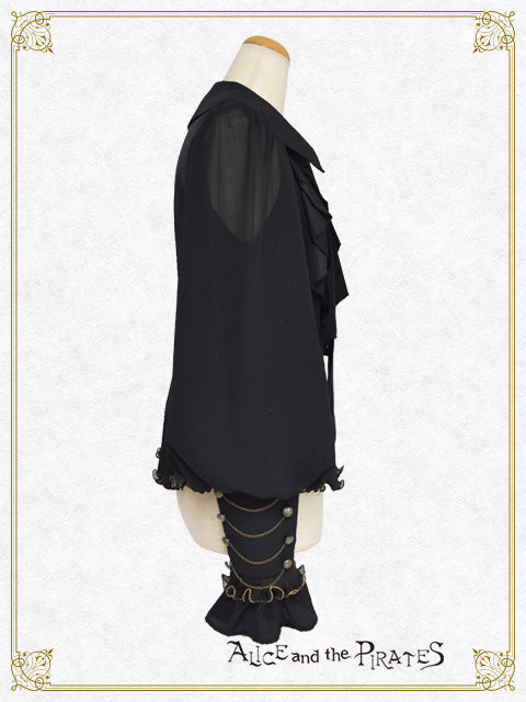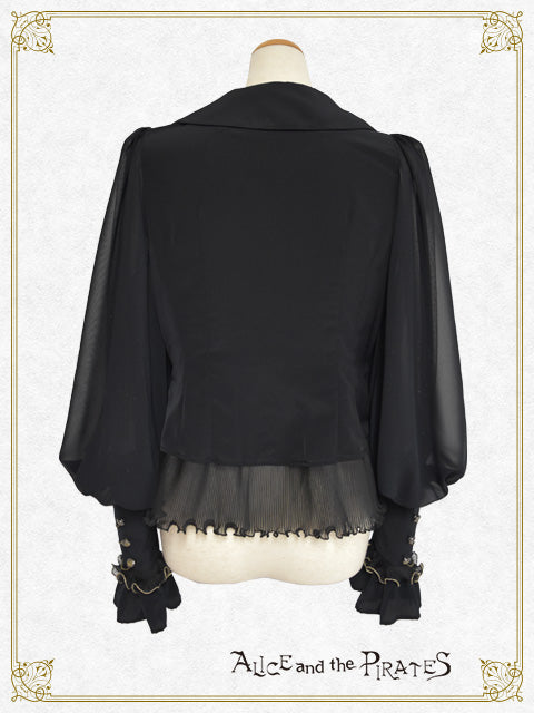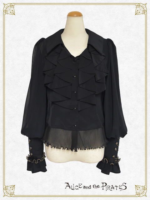 V字開きのすっきりとした首元から胸元にかけて施された、まるで海に漂うようにひらひらとした装飾が印象的なシフォン地の長袖ブラウスです。