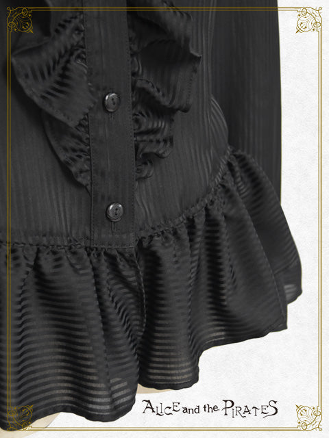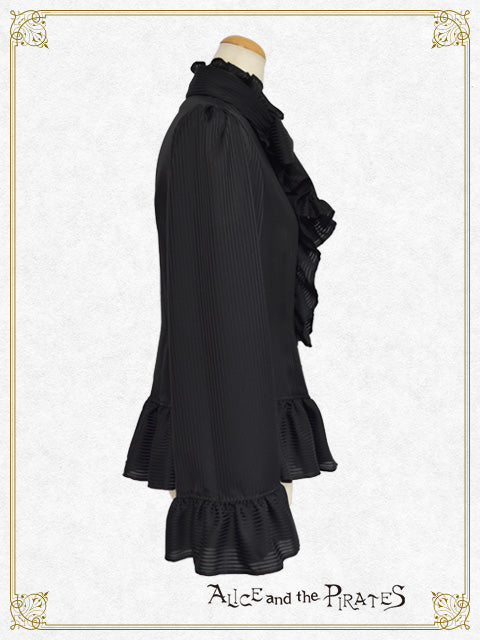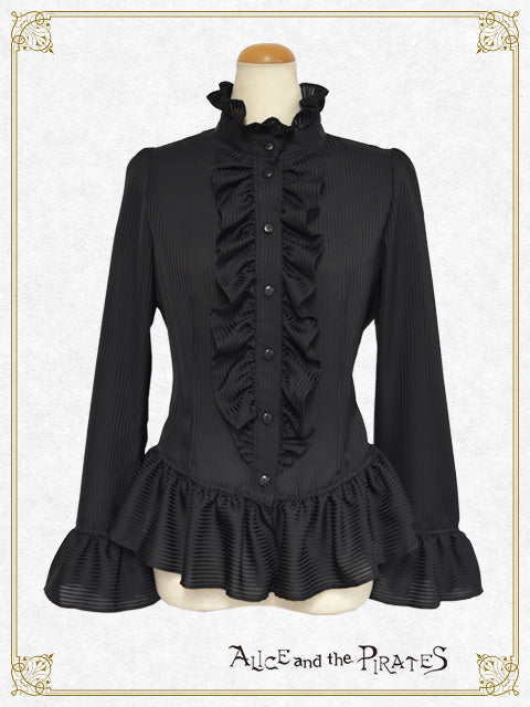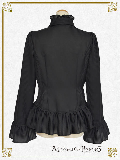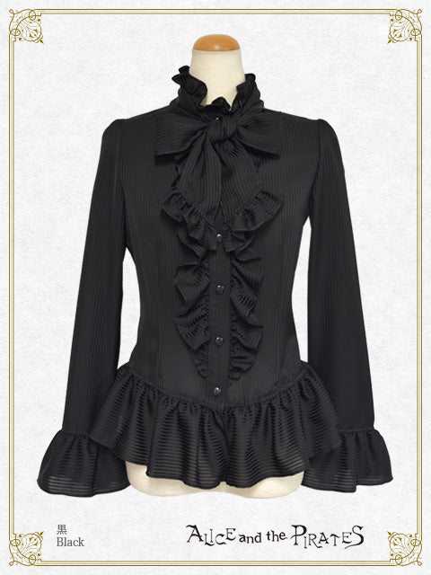 細かいストライプが入った生地を使用した立ち襟長袖ブラウスは前立て部分のたっぷりとしたフリルや、お好みでお使い頂けるボウタイが皇子コーデにぴったりです。