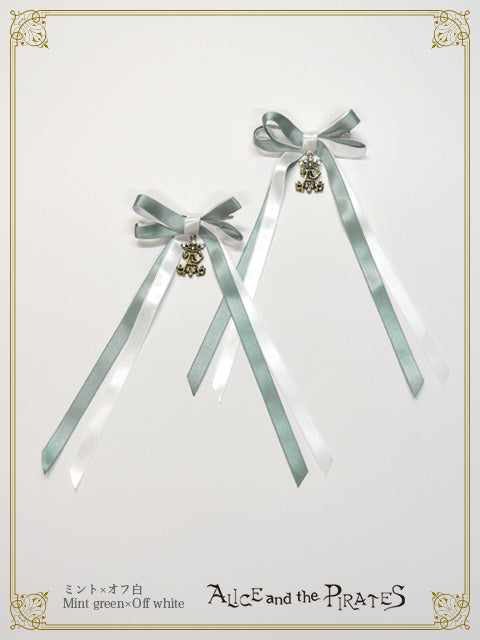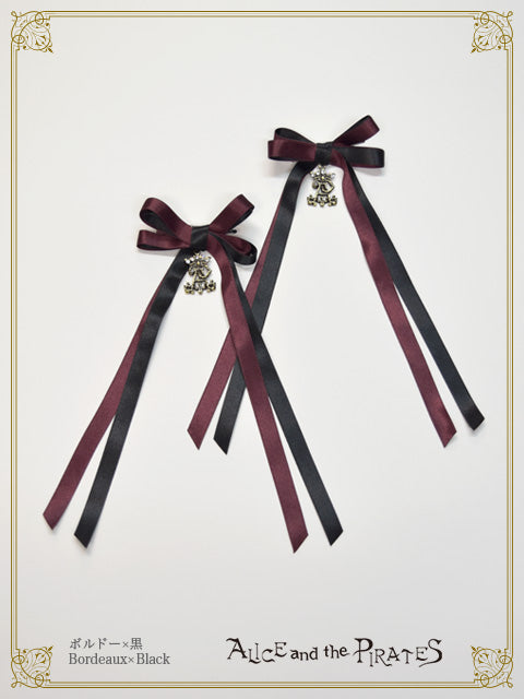 アンティークゴールドのPIRATESオリジナルチャームを中央にあしらった、2個1組のサテンリボンクリップです。