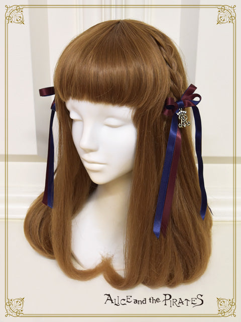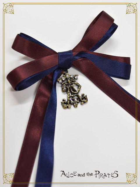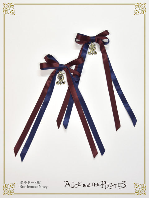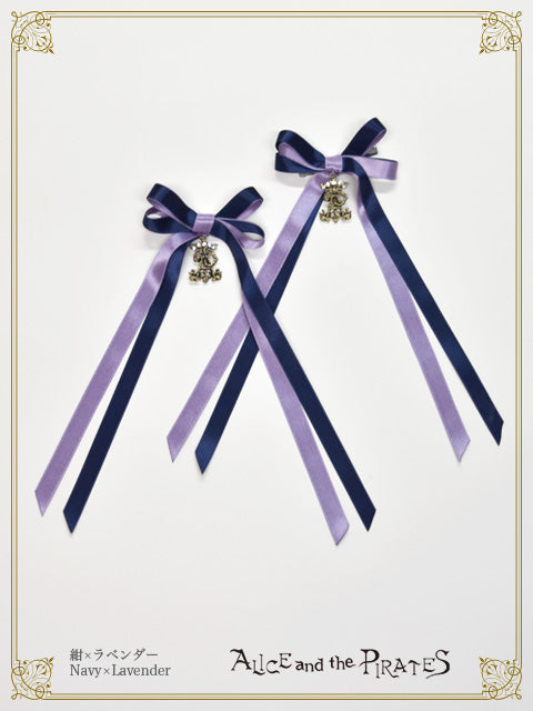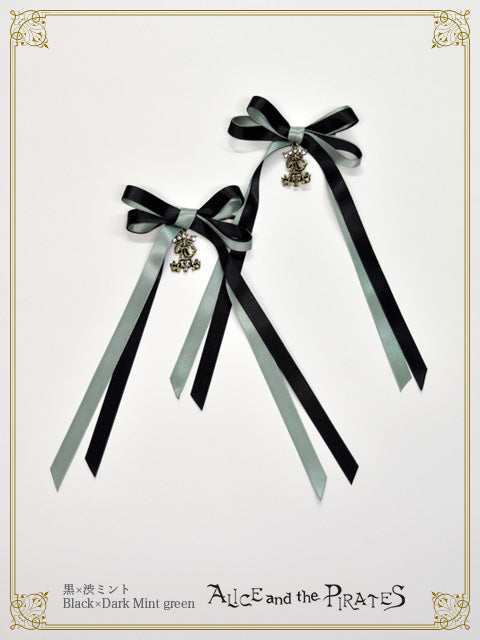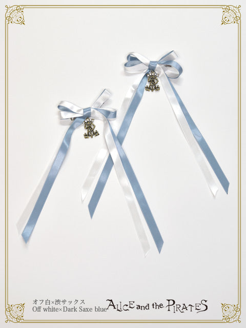 アンティークゴールドのPIRATESオリジナルチャームを中央にあしらった、対照的な2つのカラー使いが目を惹く2個1組のサテンリボンクリップです。