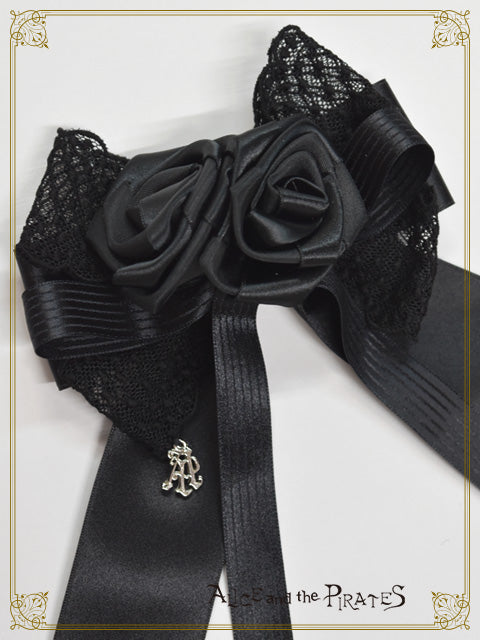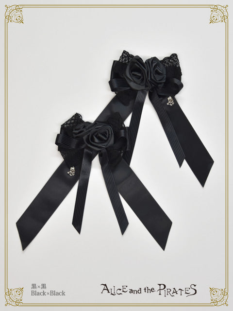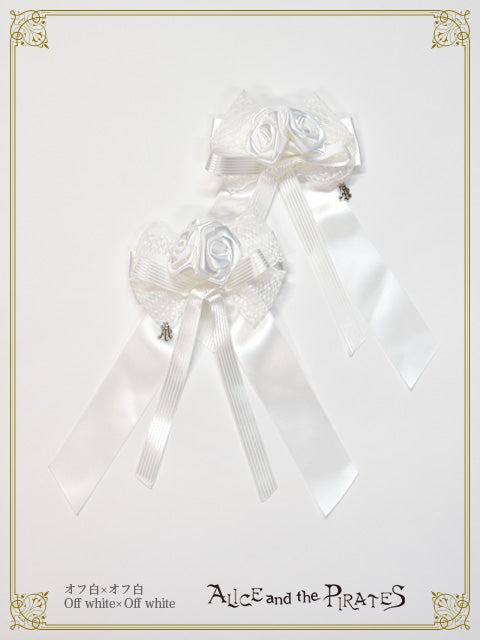 土台となるサテンおリボンにチュールレース、ストライプおリボン、立体的な巻き薔薇をあしらった2個1組のおリボンクリップは、