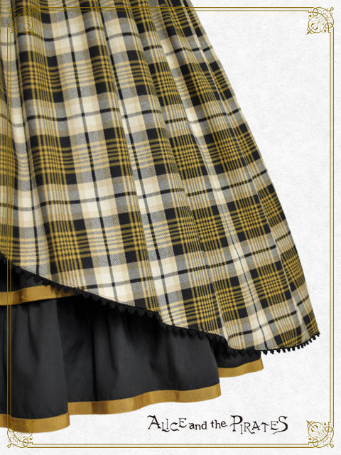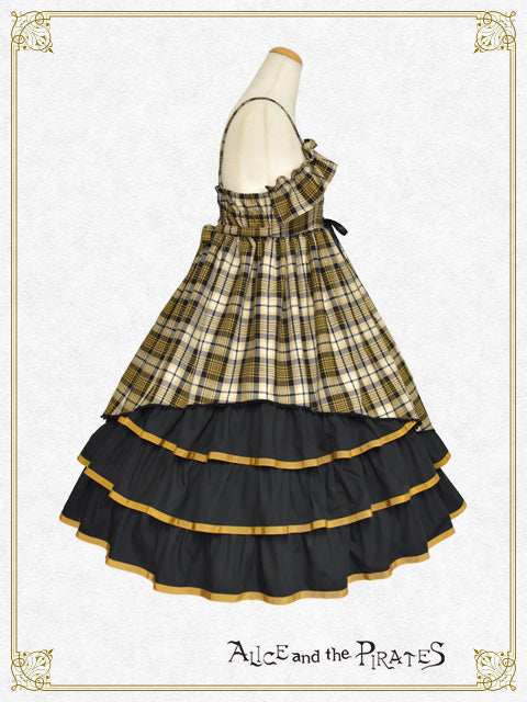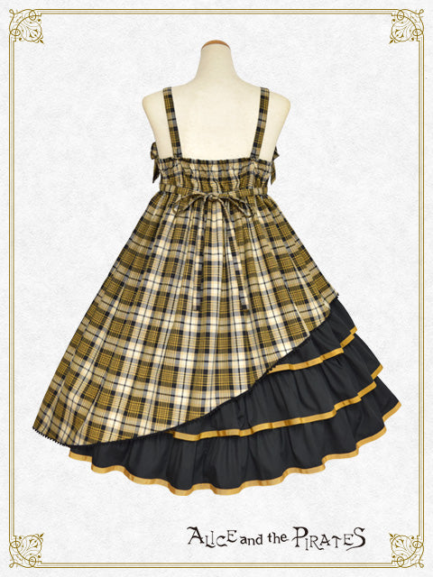 アシンメトリーなオーバースカートと、裾に配色のリボンテープをあしらった3段フリルが目を惹くジャンパースカートは、