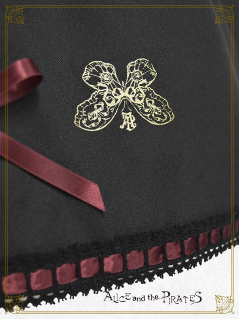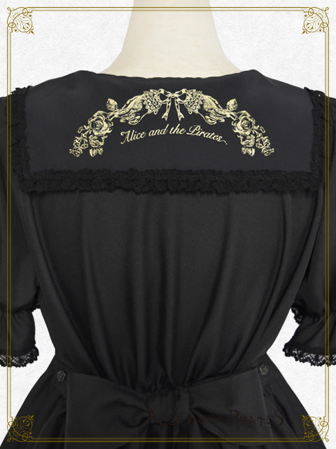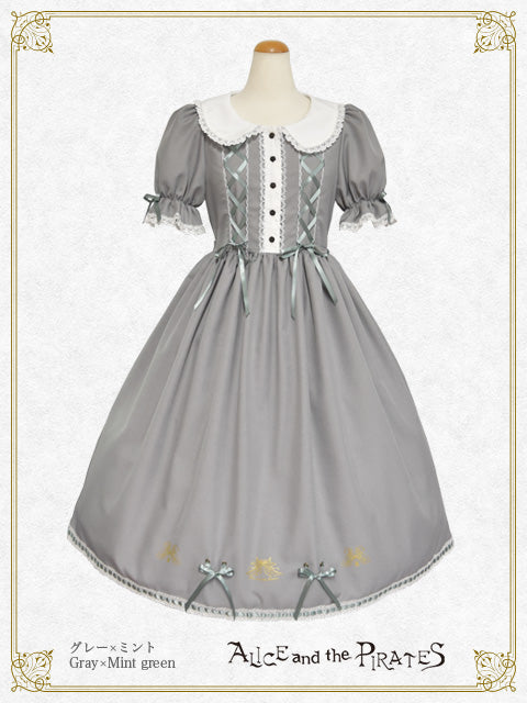 逆さまになった天使の羽根と蝶の羽根や 花束を持つ手が描かれた繊細なプリント、たくさんあしらわれたレースやサテンリボンが印象的なワンピースは、