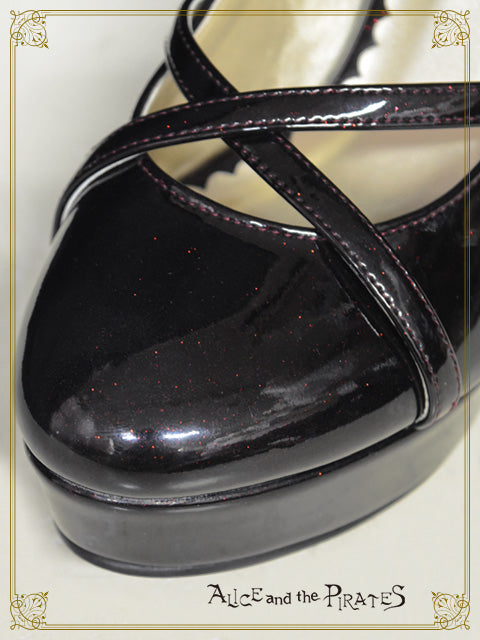 艶感のあるエナメル地に吸い込まれそうなラメが妖しく美しい一足です。