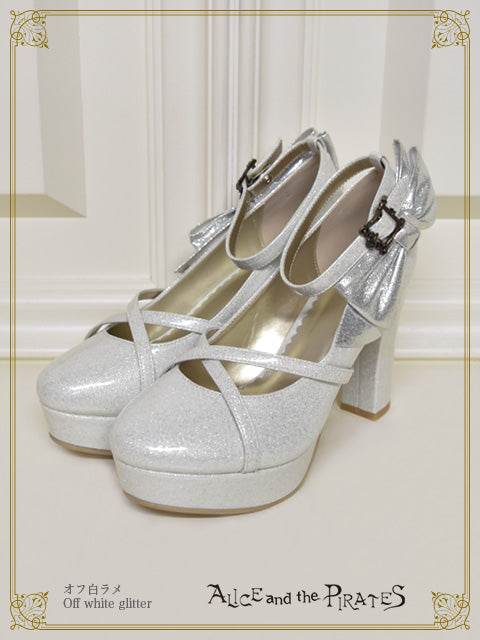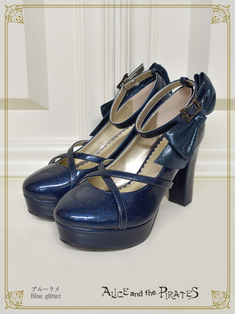 つま先のクロスストラップと踵外側につけたおおきなアシンメトリーのリボンがポイントの新作パンプス。