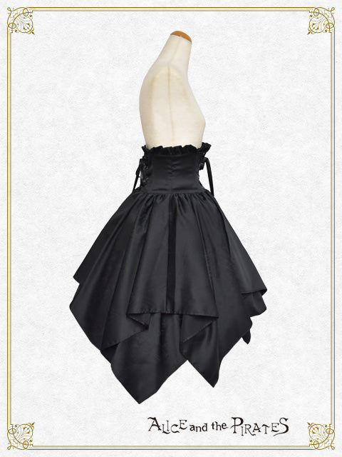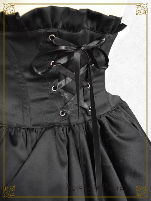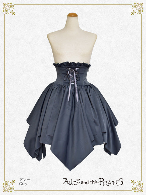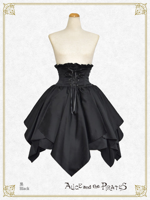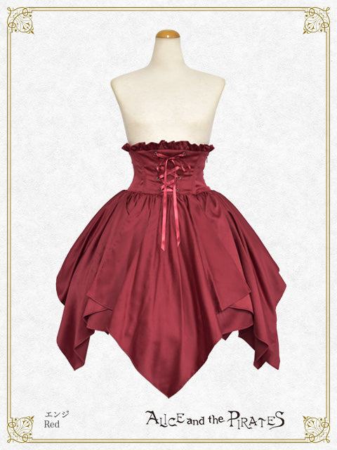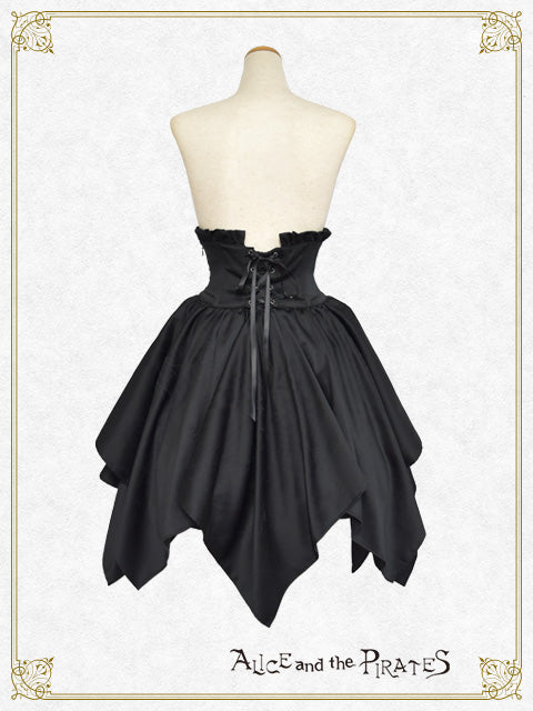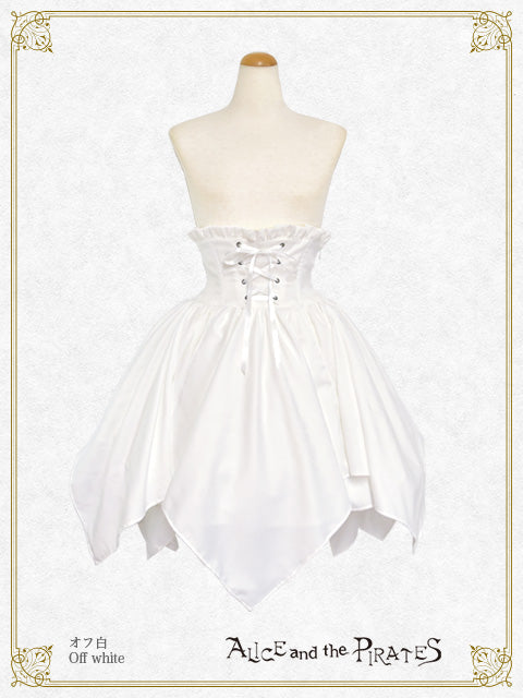 沢山重なったフリルとイレギュラーなヘムラインが装飾性の高いスカートは、すっきりしたコルセットタイプのウエストと、ボリューム感のあるスカートとの対比が美しい一着です。