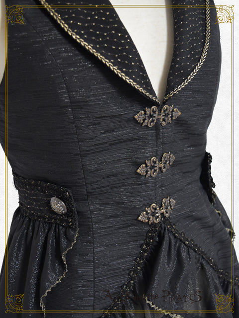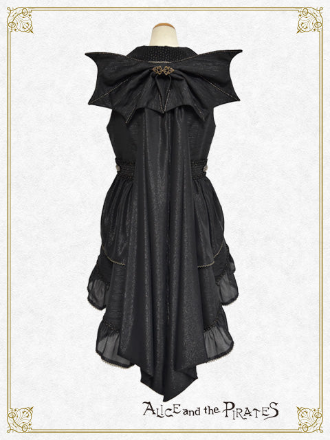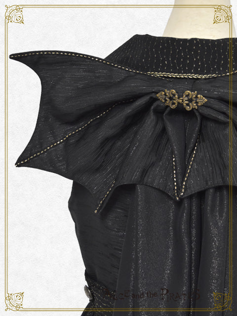 装飾的な背びれ風トレーンは回転ピンでお取り外しが可能となっており、随所にポイントとしてあしらわれたゴールドのブレード、身頃の金具パーツ重厚な雰囲気を演出。
