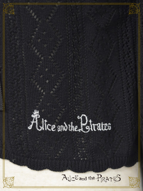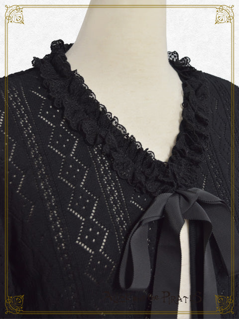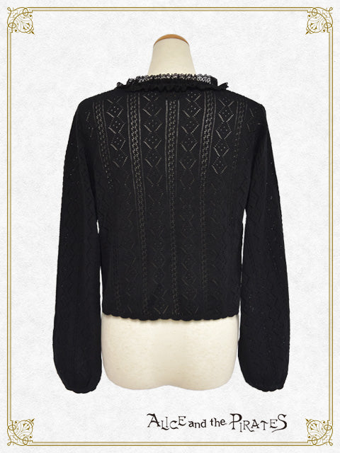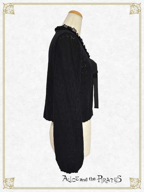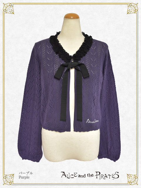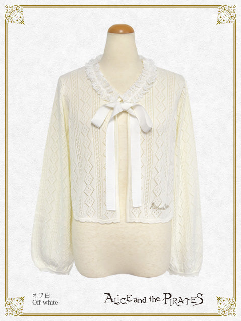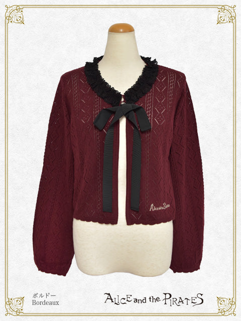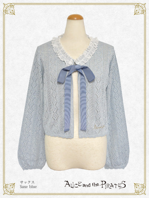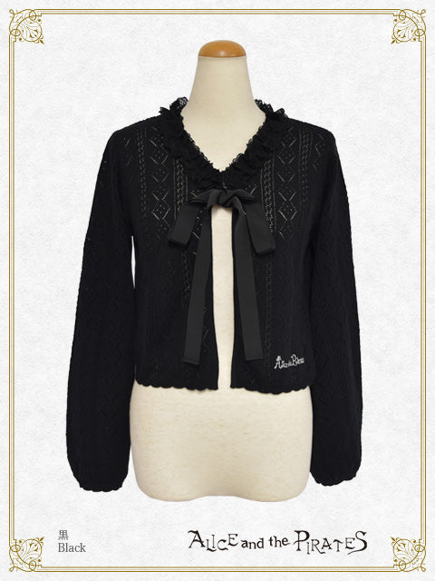 透かし模様とスカラップ、衿ぐりのレースとリボンで結んでいただくデザインがレディな印象のカーディガンです。